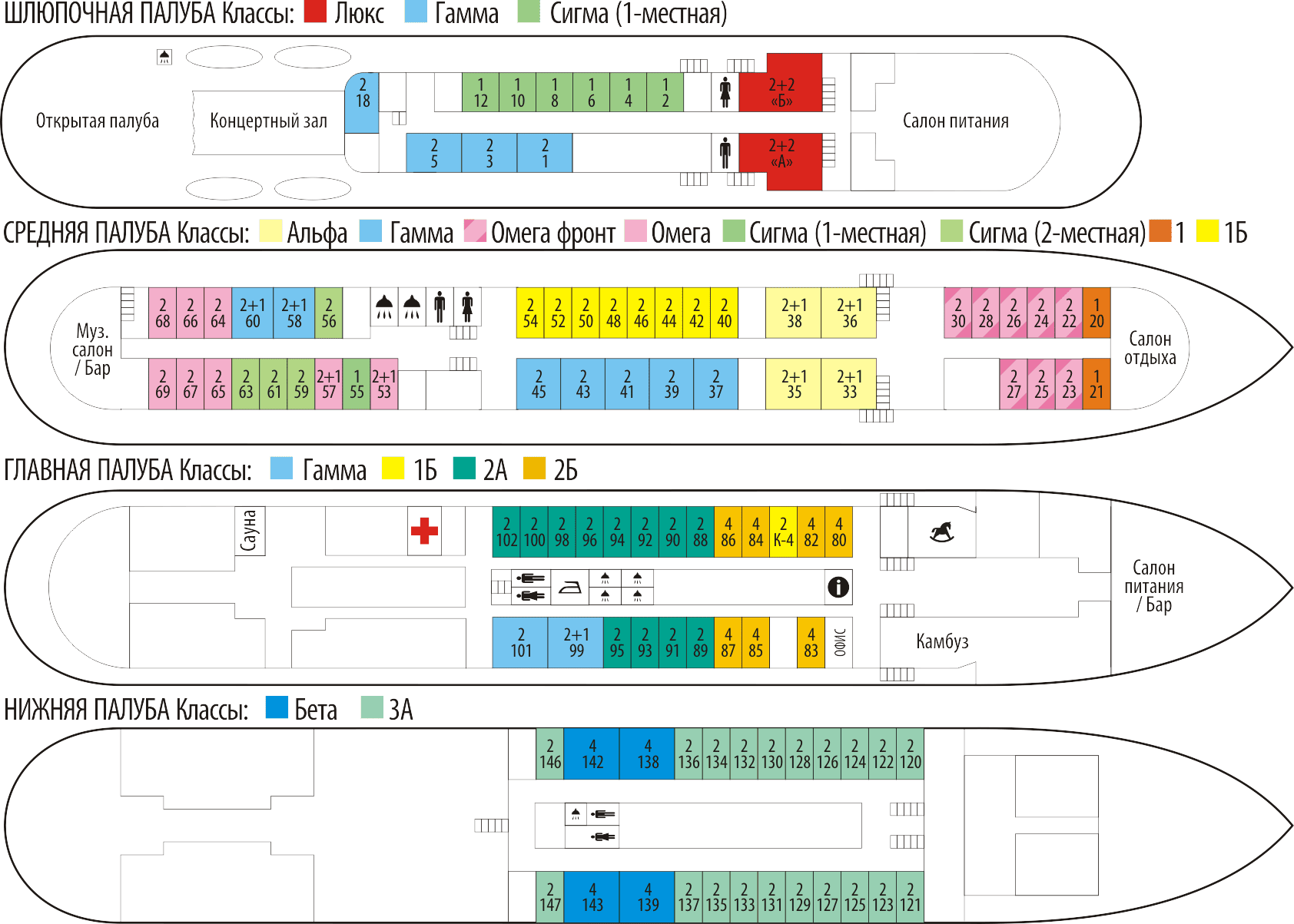 - 23 двухместных комфортабельных каюты классов «Омега фронт», «Омега», «Гамма»