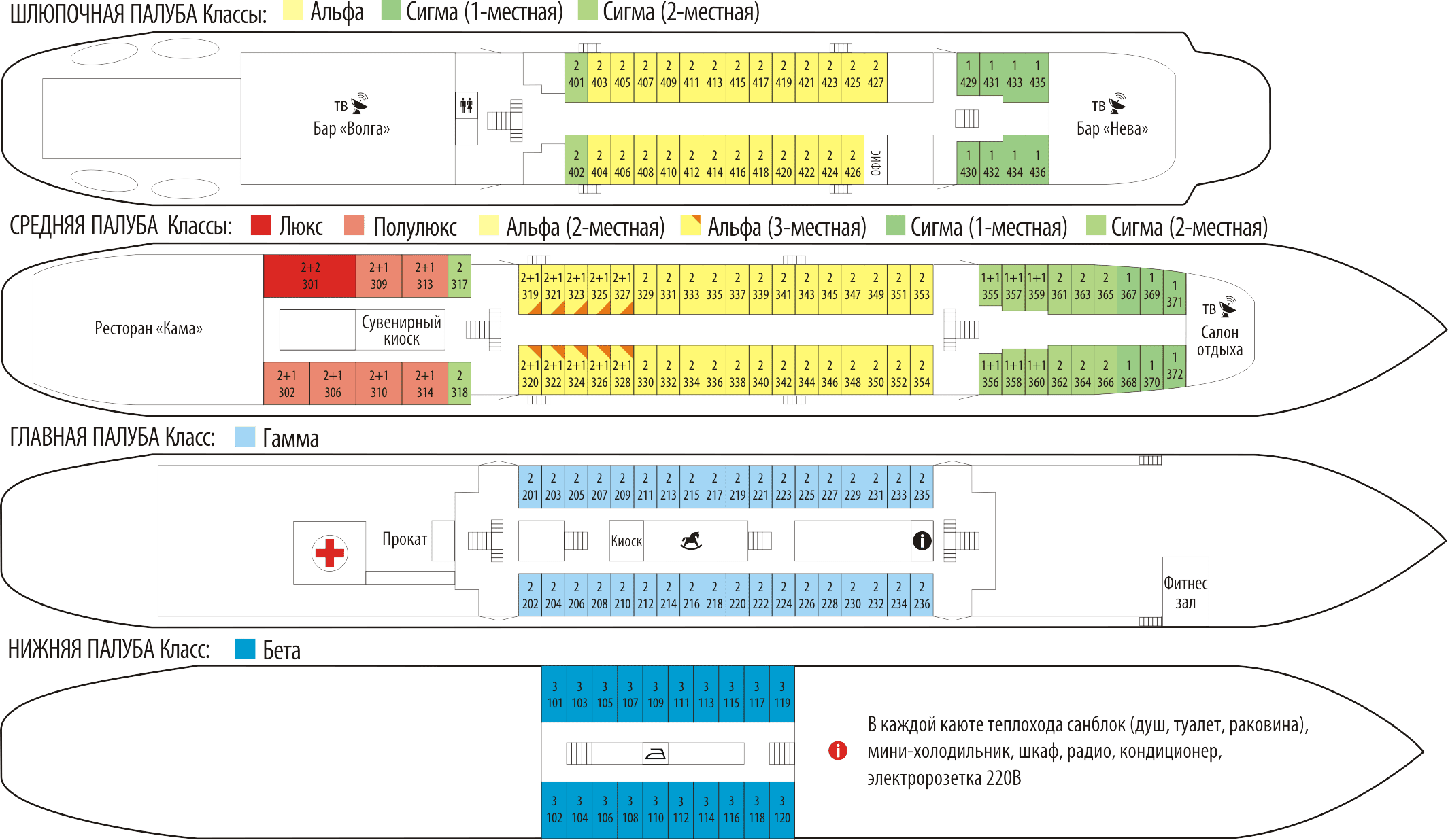 - 87 двухместных одноярусных кают классов «Альфа», «Гамма»