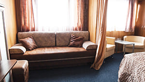 двуспальная кровать, кресло-кровать (№ 309, 403, 405) или диван (№ 333), шкаф, кондиционер, мини-холодильник, телевизор, радио, эл.розетка, санузел (умывальник, душ, туалет).