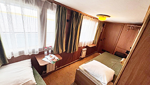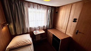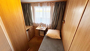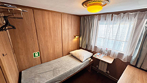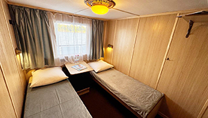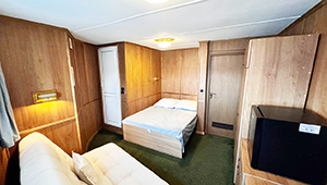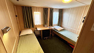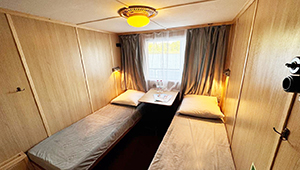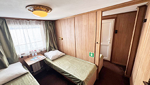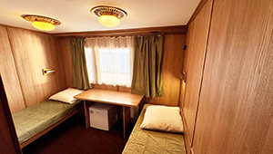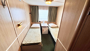 две 1-спальные кровати, кондиционирование, мини-холодильник, каютная мебель, радио, эл.розетка, санузел (умывальник, душ, туалет), окно.