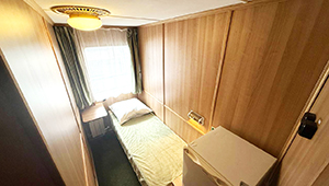 2 нижних раздельных места + 1 верхнее место, кондиционирование, мини-холодильник, каютная мебель, радио, эл.розетка, санузел (умывальник, душ, туалет), окно.